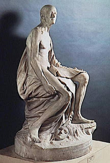 Pigalle puso manos a la obra, viajando a Ferney para realizar un modelo de la cabeza de Voltaire, que por su parecido al original causó una muy buena impresión. Es muy probable que el escultor haya seguido algunos consejos de Diderot, quien opinaba que las estatuas debían expresar la reputación del personaje representado [1]. Ahora bien, ¿por qué semidesnudo? Es difícil evitar la tentación de invocar aquí el ideal neoclásico: estaríamos hablando entonces de una desnudez “heroica”, propia de los héroes de la antigüedad clásica. Surgía así un “héroe” del pensamiento de la Ilustración. Pero hay un detalle no menor que agrega riqueza al significado: Pigalle no representó un cuerpo ideal, tal como lo exigía el canon neoclásico, sino el de un anciano decrépito, y por cierto que lo hizo con gran realismo. Suele sostenerse que tras ello se encuentra la idea de un triunfo del intelecto sobre la finitud y decadencia del cuerpo humano, mostrando así que el genio de Voltaire trascendía su envejecido cuerpo.