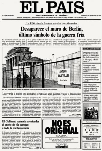 Pero a la vez, esta ciudad de contornos provincianos, tenía las ventajas de la metrópoli: gente de todas partes, vitrina de Occidente en medio del Este comunista, escenario de culturas, espacio para todos los guetos. Hasta que el séptimo día, a contrapelo bíblico, dios se despertó. La noche del 9 de noviembre también estuve allí, en la puerta de Brandeburgo, viendo al primer chico que se lanzó a tocar el muro, después a saltar sobre él, y por último a constituirse en la imagen que daría la vuelta al mundo, haciendo la “V” de la victoria, entre algarabía y abrazos, lágrimas y champán. “Die Mauer ist weg, die Mauer ist weg!” (“¡Cayó el muro, cayó el muro!”) aclamaba la multitud, y la ciudad entera se llevó la pared por delante, reventando sus costuras.