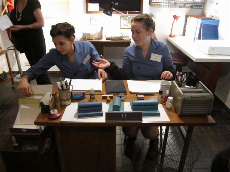 Pero el tiempo de «S.A.» es un tiempo otro respecto del de Hébequer, las revistas Nervio o Contra, e incluso de los posteriores grabados surrealistas de Audivert. Su primera acción, llevada adelante en la Fundación Gutenberg, fue en el marco de un festival de Arte Contemporáneo donde la performance de «S.A» dialogaba con disciplinas como el Video experimental, el Web Art, la animación y el arte multimedia; la «sociedad de dos» esperaba pacientemente que el público hiciera la fila, se acercara a su escritorio, completara el formulario requerido y entonces el sello pudiera hacer su magia. Como si en la evidencia del ocaso del papel y la hegemonía digital, estas dos mujeres vestidas como los personajes de La isla desierta de Roberto Arlt o de los Cuentos de la oficina de Mariani, señalaran el lejano origen del arte de masas en lo que antes se hacía con gubias y buriles.