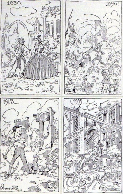 La ilustración titulada “¡Cómo cambian los tiempos!” de Moritz –en realidad un compuesto de cuatro dibujos– nos muestra las transformaciones de una ciudad, en una secuencia temporal. La ciudad es Buenos Aires. Las primeras tres escenas coinciden en mostrar una ciudad de casas bajas, a cielo abierto. En la primera, 1830, un clérigo dialoga con alguien que porta lentes y que lleva su galera en la mano. Respeto por el eclesiástico. O por la dama que a fuerza de miriñaque empequeñece el cuadro, y gana el primer plano. Un gaucho y algún personaje más se suman, lo que no obstaculiza para que en el fondo asome el Cabildo y un poco más allá, la emblemática Pirámide de mayo. Arriba, cerrando, nubes y pájaros. En 1890 el centro se corre y el telón se abre. El plumín de Moritz ahora recrea las cercanías de Plaza Lavalle, donde la revolución del Parque clausura la presidencia de Juárez Celman. Escena de guerra urbana matizada por algunos momentos de vida cotidiana: una gran pava en el fuego y el mate que acompaña a los combatientes, o un inconsciente que saborea una pitada mientras custodia la pólvora. Atrás el cielo contaminado por el fuego de los arcabuces que se disparan una y otra vez. 1913 nos muestra el presente del dibujante. La piqueta del progreso barre con los restos de la gran aldea que deja paso a la urbe moderna. Ciudad derruida por las obras del subterráneo y la edificación en mayor escala. La imagen se asemeja a la que protagonizó el intendente Torcuato de Alvear –maza en mano– cuando se echó abajo la recova que dividía la Plaza de la Victoria. Entre signos de interrogación, 1999. Caos, calles atestadas, trenes que circulan en lo alto, junto a las torres que completan el paisaje. Como si fuera poco, subterráneos, motos, autos deportivos, tranvías y aviones por doquier. De cielo, nada. La proyección distópica de Moritz para imaginar la escena, ochenta y cinco años antes, lo pone en serie con muchos ilustradores, cuentistas y novelistas sobre los que trabaja Margarita Gutman en Buenos Aires. El poder de la anticipación.*