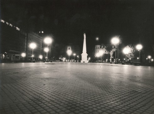 Una vista a ras del suelo como podría verla quien ha sido abatido, quien ha caído, quien ha sido tumbado. Pero sabemos que justamente el disposi-tivo de exterminio ha incluido la negación de la muerte y la imposibilidad de la tumba. El punctum barthesiano de esta fotografía es esa particular puesta en primer plano de la extensa, ilimitada trama de baldosas de la plaza. La propia imagen queda dividida en dos: la noche y las luces, los monumentos y los edificios, se asientan, se sostienen sobre esa otra mitad de la imagen que son los mosaicos. Ese territorio de la imagen geometrizado, cuadriculado, casi sin matices (salvo por los efectos de la ilumi-nación) es lo más parecido a una ausencia de traza, esto es, lo que no tiene historia (si pensamos que ésta es siempre una experiencia, que impone un recorrido y unas marcas). Ausencia de traza, vacío de la desaparición. Personas desaparecidas, junto con sus histo-rias, sus huellas, sus pisadas, sus muertes. En su lugar, un espacio con una nueva grafía de carácter uniforme, unas cuadrículas que son una reescritura que pretende no conservar nada del pasado de quienes transitaron esa plaza con tono político, quienes ocuparon plazas y calles con la expectativa de un cambio social.