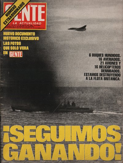 La cobertura de la prensa argentina durante buena parte de la Guerra de las Malvinas fue netamente triunfalista. Tras la estela del titular “¡SEGUIMOS GANANDO!” la revista Gente del 27 de mayo de 1982 publicaba en su tapa la fotografía, probablemente trucada, de un buque británico bajo ataque aéreo argentino. Junto al titular se reseñaban los daños infligidos a la Royal Navy: