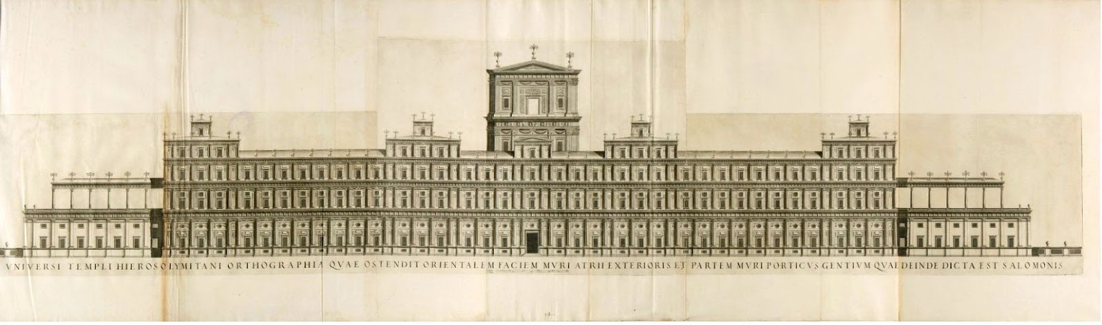 Durante la construcción de la iglesia de San Francesco della Vigna se incluyeron muchas de las recomendaciones de Giorgi, y el dux le encargó a Palladio el diseño de la fachada. El gran arquitecto se inspiró en el Panteón romano, único gran edificio de la época de la Roma imperial intacto. Destinados a usos muy diferentes, San Francisco della Vigna y la Villa Maser tenían sin embargo algo en común: la divina y musical proporción en la que se inspiraban ambos diseños. No resulta difícil imaginar a Lorenzo recitándole a su amada Jéssica su poético alegato al poder de la música en los jardines de una villa como la de los Barbaro, compartiendo encantadoras veladas en alguna sala diseñada en base a los sonidos de una escala mayor. Quizás Palladio, en su humilde condición de arquitecto humano, haya intentado obrar a imagen y semejanza del Arquitecto Divino. Giorgi estaba convencido de que Dios había creado el universo bajo las formas de un templo perfecto, de acuerdo a las inmutables leyes de la geometría cósmica. Por ello entre el diseño divino, el bíblico Templo de Salomón y la arquitectura vitruviana tenían que encontrarse claras correspondencias. Durante mucho tiempo esta idea desveló a toda una legión de estudiosos. Entre 1596 y 1604 los jesuitas españoles Jerónimo del Prado y Juan Bautista Villalpando publicaron un monumental estudio acerca del Templo de Jerusalén según la visión del profeta Ezequiel, en donde llevaban a cabo una reconstrucción hipotética del sagrado edificio. Villalpando era un brillante matemático discípulo de Juan de Herrera, el arquitecto de El Escorial de Felipe II. Estaba convencido de que en el diseño del Templo de Salomón Dios había dejado “estampada con maravilloso arte la semejanza de todo cuanto existe bajo la inmensa cubierta del universo”.