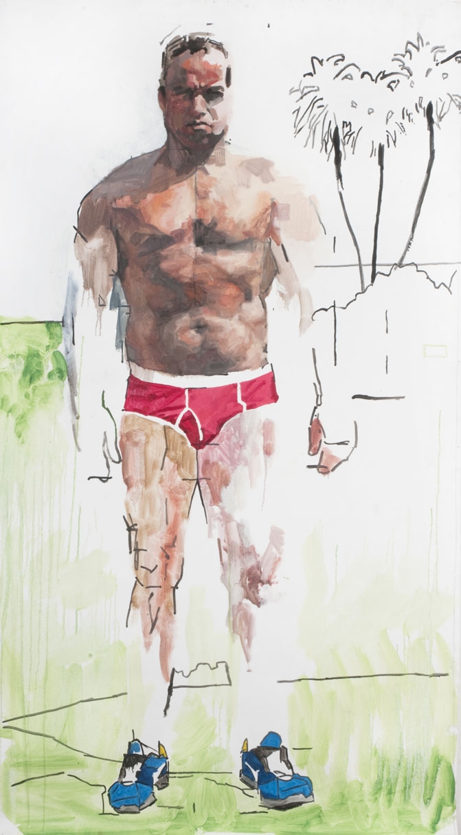 Hombres y mujeres en permanente (de)construcción, en un juego de falta y resto: cabezas sin cuello, tórax sin cintura ni cadera, pies sin pantorrillas, hombros sin brazos. Cuerpos incompletos. Pantalones pintados con esmero que resaltan la ausencia de las piernas, bufandas retratadas con exactitud milimétrica anudadas a cuellos que se desvanecen en la nada, en las pinceladas del fondo. El cuidado impetuoso con que LOB trabaja la ropa de sus modelos contrasta con el interés relativo que le suscita su fisonomía. Se trata más de captar al vuelo un gesto, una pose, que de intentar representar a una persona de forma mimética. La potencia pictórica de LOB se desencadena de manera furiosa en los detalles, un par de zapatos, un short. Y luego, como la ola que baña la arena playera, se repliega dejando en el camino una mano, una porción de cara, un cuello.