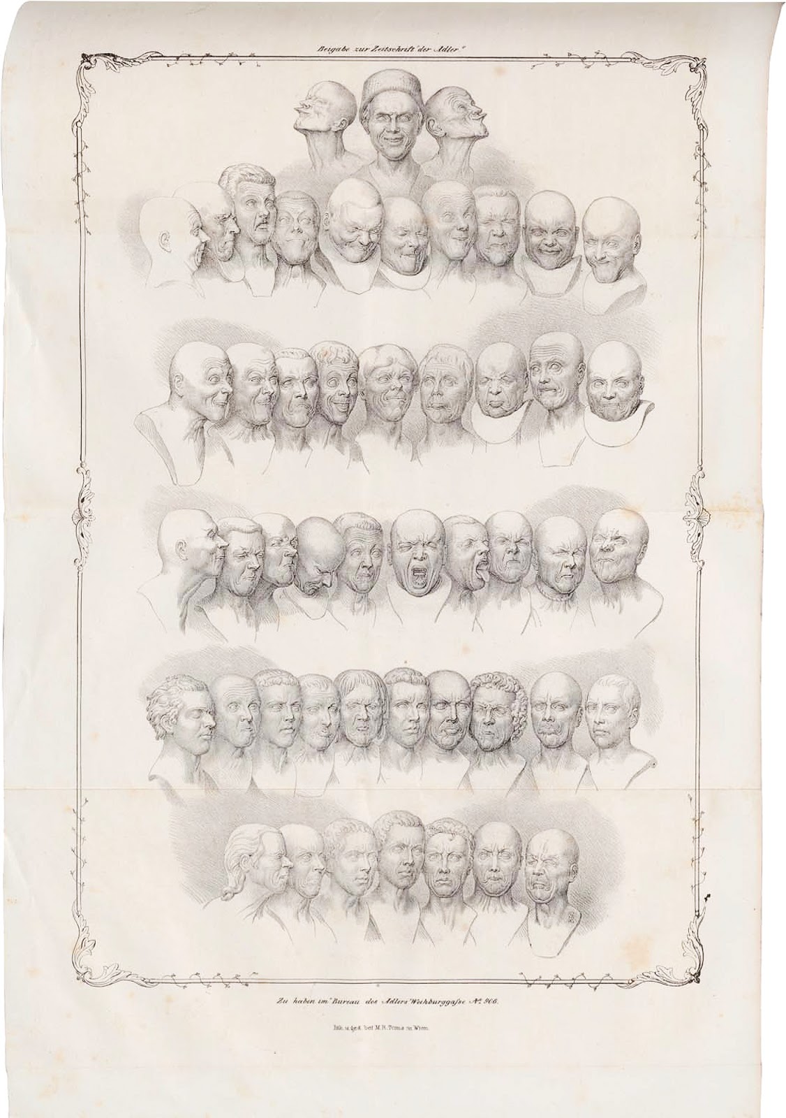 Tras la muerte de Messerschmidt las cabezas fueron expuestas por primera vez en un puesto del Prater, el parque de atracciones de Viena. La clase de nombres que se les puso a partir de entonces, tales como El hombre que bosteza, El hombre que sufre estreñimiento o El calumniador, sugieren que ya desde el principio nadie sabía a ciencia cierta cómo interpretarlas. Hubo quienes consideraron que reproducían una colección de gestos relacionados con la teoría de las fuerzas magnéticas del sistema nervioso de Mesmer. Sin preocuparse por el significado de la colección, muchos artistas las tomaron como modelos para estudiar la diversidad de gestos faciales. El grabador austríaco Matthias Rudolph Toma realizó una litografía con cuarenta y nueve de ellas para acompañar una biografía de Messerschmidt aparecida en el diario vienés Der Adler en noviembre de 1839.