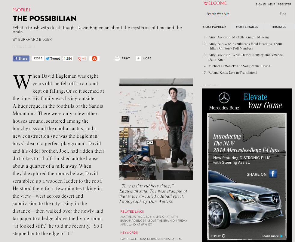 Hace dos años encontré de casualidad este artículo en The New Yorker. Es un extenso perfil sobre alguien llamado David Eagleman, un profesor de neurociencias del Baylor College of Medicine de Houston, Texas. En su laboratorio estudia la forma en que el cerebro percibe el paso del tiempo. Su fascinación por este campo le viene de la infancia, de cuando tenía ocho años y casi se mata viniéndose abajo de un techo en una casa en Albuquerque (cualquier episodio de Breaking Bad sirve para ubicar el escenario). El recuerdo, extremadamente vívido del accidente, despertó su curiosidad sobre la forma en que las situaciones de riesgo de vida condicionan la actividad del cerebro, provocando un aumento de la cantidad de detalles registrados y una dilatación en la percepción del tiempo.