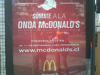 La fotografía del cartel de McDonald´s fue tomada el jueves 20 de junio. El anuncio se encuentra emplazado sobre un kiosco, ubicado en la intersección de la calle Tabancura y la Av. Kennedy, en el barrio de Las Condes. La empresa de hamburguesas convoca a los jóvenes, por eso lo de la “onda”, para que trabajen en sus locales. La gorra y la conjugación imperativa mezclan la experiencia laboral con la pertenencia a las filas de un ejército, el mismo tono y síntesis usaba la propaganda gráfica que convocaba para participar de los ejércitos durante la primera y segunda guerra mundial. Al mismo tiempo, tal como también lo hacen otras firmas multinacionales como Starbucks o Apple, la experiencia laboral se cruza con la identidad del club. Trabajar en un Macstore o en el negocio del café tendría «onda», la empresa se ocupa de atribuir una identidad a los jóvenes trabajadores. El cartel propone que presenten sus currículum vitae en una dirección: Av. 11 de septiembre 2085.