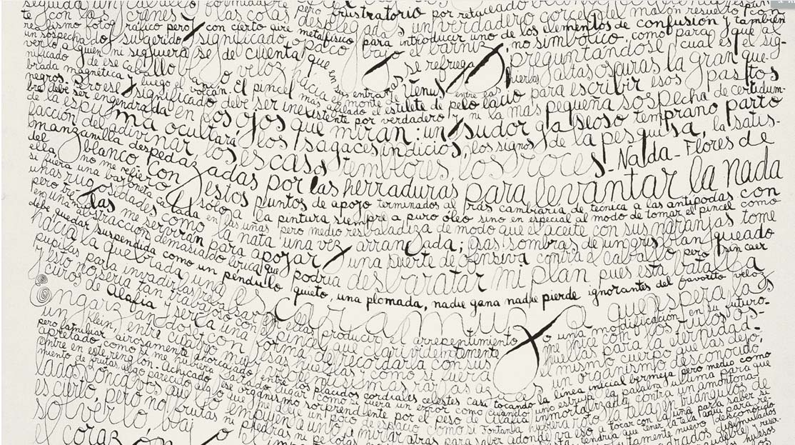 El mismo año que publicó Escrito en el aire junto a Alberti, compuso Cuadro escrito. Desde el 63 incluía palabras en sus lienzos, ese abril escribió la primera Carta a un general, donde se distinguen letras y palabras deformadas. Cuadro escrito fue leído por Mari Carmen Ramirez como la primera pintura conceptual de Latinoamérica, es posible emparentarla a las obras de Allan Kaprow (Words, 1961) y Joseph Kosuth (One and Three Chairs, 1965-1967; Titled (Art as an idea [as idea]) (meaning), 1967-68). Adscribir su obra al arte conceptual es una opción, pero también vale quitar, aunque sea por un momento, los rótulos de la crítica y evaluar su legado no por el lado de lo que rompió o inauguró, sino por lo que continuó o volvió más complejo. Cuadro escrito, como los textos que acompañaron al mingitorio de Duchamp, es una obra que habla de la obra, borra los límites entre la interpretación y la pintura, entre el concepto y el objeto, aniquila al arte retiniano. Lo que se lee en el cuadro escrito es un texto sobre el cuadro posible, comienza diciendo: