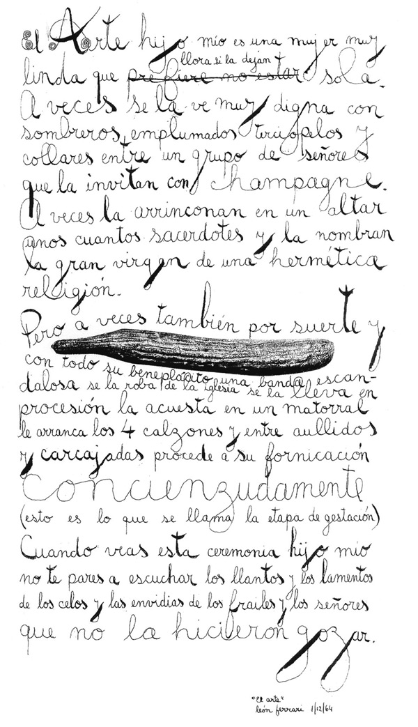 Pero a veces también por suerte y con todo beneplácito una banda escandalosa se la roba de la iglesia se la lleva en procesión la acuesta en un matorral le arranca los 4 calzones y entre aullidos y carcajadas procede a su fornicación concienzudamente (esto es lo que se llama etapa de gestación). Cuando veas esta ceremonia hijo mío no te pares a escuchar los llantos y los lamentos de los celos y las envidias de los frailes y los señores que no la hicieron gozar.» “El arte”, León Ferrari, 1/12/64