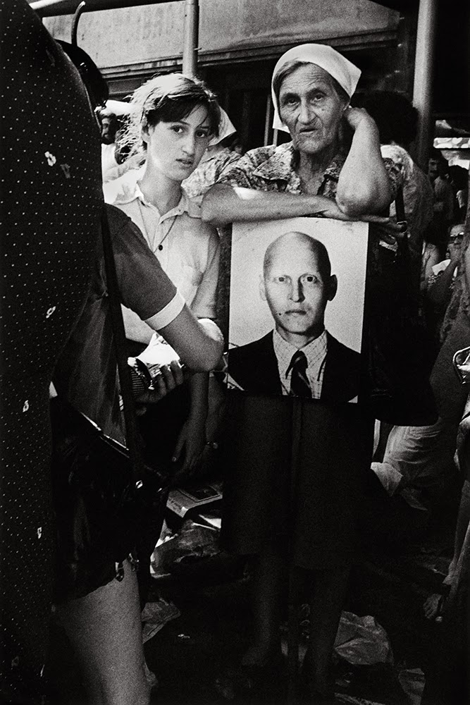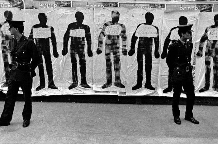 Seguramente la más conocida de las fotos de la serie aquí reunida, “Siluetas y canas” es una composición excepcional que permite entender cómo la labor de documentar pormenorizadamente el acontecimiento se conjugó en el trabajo desplegado por Eduardo Gil con la intención de capturar el instante decisivo a la manera de Cartier-Bresson. Construyendo una metáfora contundente, asoma detrás de los afiches publicitarios que cubre la hilera de siluetas la repetición de una única palabra: PODER. La simetría casi especular del gesto de los dos policías armados “vigilando” a las siluetas como antes habían secuestrado y desaparecido a quienes ellas representaban. Los nombres propios de las siluetas, todos apellidos que empiezan con la letra “a”, proveen la pista del procedimiento de nominación de las siluetas a partir de un listado alfabético de los detenidos-desaparecidos denunciados hasta entonces.