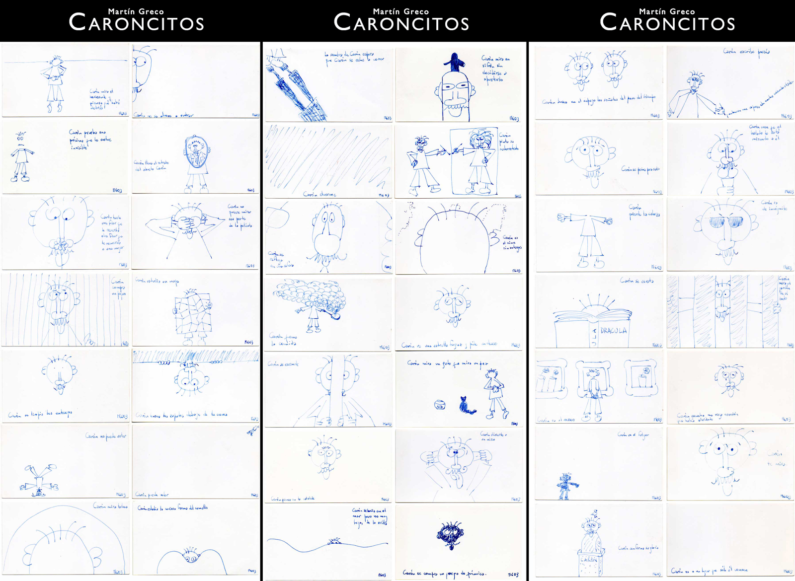Con gratitud a Caron, en su homenaje, reproduzco aquí algunos de esos caroncitos, dibujados en mínimas tarjetas de diez por cinco, por amor a él y a las historias que nunca podrá dejar de contarnos.