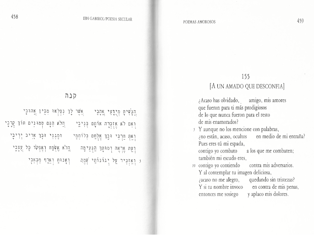 Fue una tarde de octubre del año pasado, allí mi amigo Sandro me esperaba, a modo de sorpresa, con la obra reunida de poesía de este excepcional poeta del Al-Andalús nacido en Málaga alrededor del 1022 y muerto en Valencia en el 1053 ó 1057. Poesía Secular de Selomo Ibn Gabirol es una versión bilingüe en su bello original hebreo y su buena traducción al español.