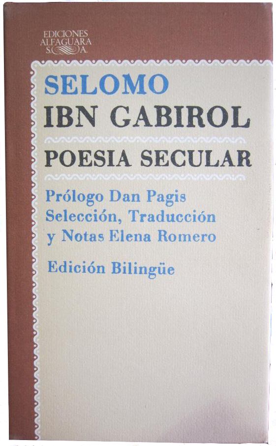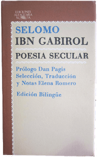 Eso me sucedió con Poesía Secular de Selomo Ibn Gabirol editado por Alfaguara en noviembre de 1978 en su colección de Clásicos con Prólogo de Dan Pagis, traducción y notas de Elena Romero. De 22 x 13 cm, con 532 páginas, tapa dura y sobrecubierta; Poesía secular es un libro inhallable en las librerías de Madrid, Granada, Barcelona o Buenos Aires. Sin embargo, en Librería Norte, en su misterioso sótano más exactamente, apareció el ejemplar que tengo en estos momentos entre mis manos.