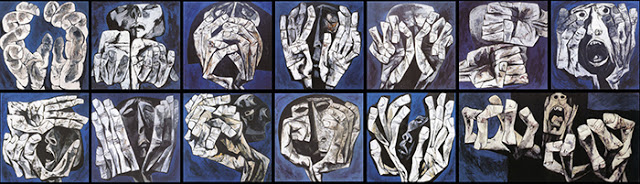 En ninguno de los diferentes ejemplares que copian la serie Las manos, está ausente el horror: en cada uno de ellos es un efecto buscado y logrado por ser, quizás, el efecto por antonomasia de la serie. La discusión y los desplazamientos, al contrario, se hallan en el nivel de las manos. Dedos particulares si los hay los de Guayasamín, toman formas diferentes en cada una de las copias y discuten entre sí, se preguntan por la obra de este pintor tan asimilado, por sus modos de construcción y por el sistema de prioridades en juego. Y es que cuando el horror fue –en términos de efecto–, esos dedos fueron y vinieron cuarenta veces.