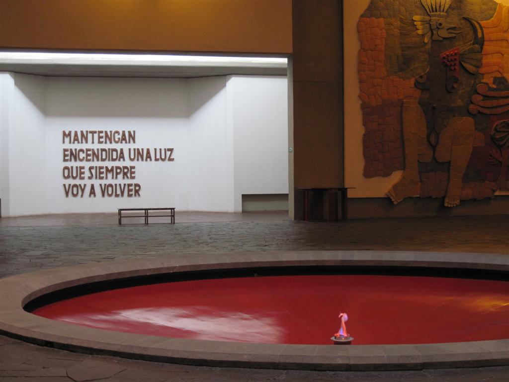 “Mantengan encendida una luz que siempre volveré” reza una pared en el piso inferior de la Capilla del Hombre, justificando un fuego siempre encendido su centro. La presencia de Guayasamín es ineludible. Obra, Maestro y Legado afirmados por su voz que resuena incansablemente en el discurso que circula en el predio. ¿Es posible frenar la persistencia del eco en una construcción de esas dimensiones?