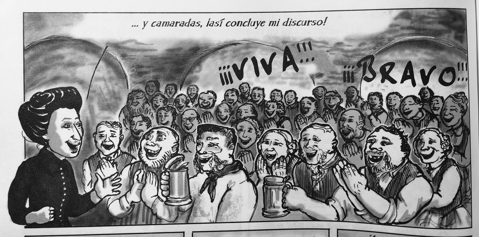 La Rosa Roja subraya aspectos clave de la biografía. Por ejemplo, al llegar a Alemania, Rosa decide activar políticamente en una zona de trabajadores mineros, conservadores y católicos. Llega sola, frente a todos los hombres, primero la miran con recelo, en la página siguiente de la novela gráfica están todos contentos, lo que no tenemos es su voz, están allí algunos pasajes de sus discursos, están los dibujos de Kate Evans, pero no la voz que cautiva a los trabajadores mineros, ella se esconde entre dibujo y dibujo, detrás de las imágenes que vemos, en el punto del montaje va creciendo a lo largo del libro el misterio de esa voz cautivante, capaz de convencer a los más difíciles de llevar a su causa.