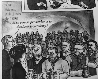 Lee a Marx desde temprano. En la biografía se la ve explicando a sus hermanos la teoría del valor y la mercancía. A los 17 años, integrantes del Partido Socialista le piden a Rosa que no vaya más por allí, le informan que la policía está interesada en ella, que en cualquier momento pueden detenerla. Les pide a sus padres viajar a Suiza para seguir sus estudios en la Universidad de Zúrich. En el invierno de 1889, a los 19 años llega sola a esa Universidad, primero a estudiar botánica y zoología; pero luego se decide por la filosofía, las ciencias políticas, la historia y la economía. En Zúrich conoce a los principales líderes socialistas rusos en el exilio, se corta el pelo, se enamora, viaja a París, se esconde de la policía, deja el corsé, empieza a usar corpiño, participa de la Internacional Socialista donde habla y deja a muchos magnetizados con el poder de su discurso. En 1989 obtiene el título de doctora en Derecho Público y Asuntos Económicos. Escribe en los periódicos y años después decide trasladarse a Berlín. Obtiene la nacionalidad alemana y se afilia al Partida Socialista Alemán.