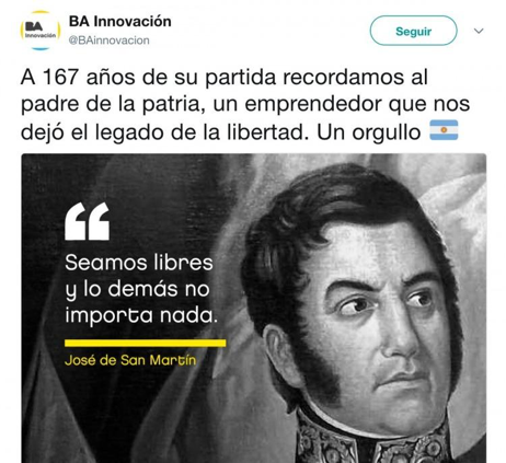 “A 167 años de su partida recordamos al padre de la patria, un emprendedor que nos dejó el legado de la libertad. Un orgullo”. Tal el mensaje difundido el mes pasado en las redes por el Ministerio de Modernización de la Ciudad de Buenos Aires para conmemorar a José de San Martín. Lo mismo dijo el presidente Mauricio Macri cuando conmemoraba a Manuel Belgrano: “un incansable trabajador por el futuro de la Nación, innovador, emprendedor”. La palabra “emprendedor” fue utilizada por primera vez en 1755 por el economista Richard Cantillon en su Ensayo sobre la naturaleza del comercio en general para referirse a toda persona que compraba productos a precios conocidos para venderlos en el mercado a precios desconocidos. Poco más tarde Jean-Baptiste Say caracterizó al emprendedor como un agente económico que une medios de producción (tierra, trabajo y capital) con el fin de producir para el mercado. En el siglo XX Joseph Schumpeter definió al emprendedor como un ente generador de crecimiento económico. Hoy en día es usual considerar la palabra “emprendedor” como sinónimo de “empresario”.