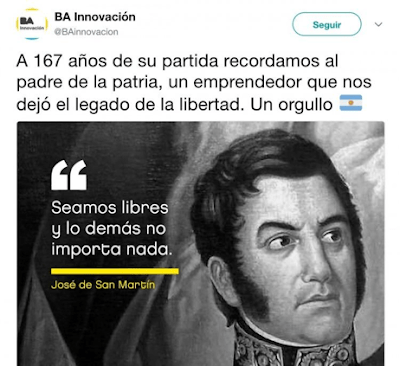 Hoy las necesidades son al parecer otras. Considerar que San Martín y Belgrano eran emprendedores está en sintonía con la nueva dirección que se le quiere imprimir a la escuela pública argentina. El discurso homogeneizador del mercado no se detiene ni siquiera ante los héroes de la independencia: trata de absorberlos y resignificarlos sin piedad. Un incansable impulsor del liberalismo en nuestro país como Juan B. Alberdi supo sin embargo mantener las diferencias: si quería hablar de emprendedores hablaba de William Wheelwright, no de San Martín. Durante décadas los escolares argentinos se vistieron de San Martín y Belgrano con una espada de juguete en la cintura, un bicornio de cartulina azul y largas patillas negras dibujadas con corcho quemado. Quizás tengan ahora que cambiar de indumentaria y vestirse con trajes elegantes. ¿Llegarán a cambiar el sable corvo sanmartiniano por un maletín de ejecutivo?