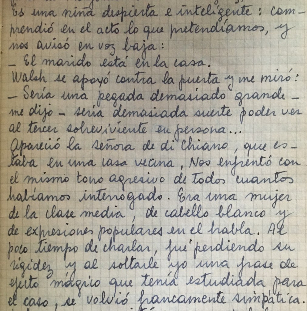 La apuesta editorial de publicar el diario personal de la investigación, con las páginas escaneadas de los cuadernos en tamaño real y la decisión de sus herederos de compartirlo, nos permite, en tanto lectores, que tengamos acceso a un registro único. No hay transcripción del testimonio de Enriqueta Muñiz: sus páginas se suceden al igual que si hojeáramos cada cuaderno, aunque se pierda la textura original del papel y el particular olor que encierra algo escrito hace más de sesenta años y conservado en una caja. Pero su esencia se mantiene: la frescura de la letra manuscrita, regular y prolija para narrar un oscuro acontecimiento político que signó el devenir político de medio siglo. Es la perspectiva de quien fue parte central de esa investigación, conocida más tarde a través de un libro difícil de clasificar, firmado por un solo autor y reescrito en sus distintas ediciones. A partir de la de 1964 aparece un reconocimiento: “Desde el principio está conmigo una muchacha que es periodista, se llama Enriqueta Muñiz, se juega entera. Es difícil hacerle justicia en unas pocas líneas. Simplemente quiero decir que si en algún lugar de este libro escribo ‘hice’, ‘fui, ‘descubrí’, debe entenderse ‘hicimos’, ‘fuimos, ‘descubrimos’”. Ni las tachaduras de algunos nombres, ni el modo candoroso de la narración sobre el día a día de lo que se investiga alteran la gravedad de lo que significa un crimen de Estado. Más bien ponen en relieve el coraje y la templanza de una joven, extranjera, de 22 años, que por un lado merodea los detritos del poder dictatorial de turno para trabajar codo a codo –o de igual a igual– con quien le había propuesto ser parte de esta patriada, y por otro, aparece como quien debe cumplimentar el límite horario que su padre le impone para llegar a su casa, lo que la deja fuera de alguna entrevista.