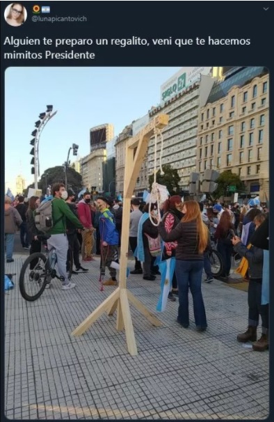 Pero hace un mes un expresidente volvió a hablar de golpe de Estado. Hace una semana otro expresidente publicó una columna en uno de los diarios más importantes del país en la que dice que el actual gobierno peronista ataca de manera sistemática y permanente la Constitución buscando la suma del poder público, controlar a los ciudadanos e impedirles la posibilidad de manifestarse libremente. En el mismo diario uno de sus columnistas más destacados afirma, en la misma línea, que el país vive un colapso institucional en el que la Justicia está siendo colonizada por el gobierno y la Cámara de Senadores está siendo controlada, a la manera de una “republiqueta africana”, por su presidenta, junto a sus “obedientes” senadores. En una columna de opinión publicada en otro diario importante un exfuncionario ya habla lisa y llanamente de profunda decadencia de nuestro sistema democrático. “El momento es extraordinario – afirma – porque CFK ya no disimula su espíritu dictatorial. Siempre supimos que no tenía pasta de líder democrática y que el rol que mejor le calzaba era el de líder autoritaria (…) Los senadores del PJ son como esos lacayos que tenía Stalin que sólo hacían política para satisfacer a una persona autoritaria cuyos comportamientos deben ser analizados más en el terreno de la psiquiatría que de la política”. Luego de describir un escenario político sombrío, hace un llamado a las fuerzas opositoras y a la población en general para salir a luchar por la libertad. Son muchos los periodistas que trabajan en medios opositores al gobierno que hablan todo el tiempo de ataques a la libertad de expresión, aunque no se sabe de ningún caso de periodista prohibido, preso o asesinado. En suma, desde distintos sectores de la sociedad y de la oposición política se viene manifestando que la República está nuevamente en peligro. Se han convocado manifestaciones de protesta en las que han aparecido carteles que hablan de la necesidad de salvarla. En una de ellas se montó una horca con alusiones al presidente en ejercicio.