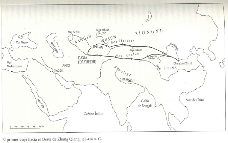 En 141 a.C., Liu Che se convirtió en el sexto emperador de la Dinastía Han con el nombre de Wu y todos, súbditos o no, lo conocieron como Han Wudi. Su imperio lindaba con territorios en los que dominaban las tribus nómades de los Xiongnu, salvajes arqueros de a caballo con quienes sus antepasados habían lidiado enviando tributos de princesas. Sin embargo, estos pueblos no parecían entender que el tributo implicaba siempre un presente que se recibe y otro que se entrega, y lo único que podían ofrecer era una relativa paz en la frontera. No atacaban de forma organizada, pero continuaban entrando a los poblados agrícolas cercanos a su territorio como si fueran malones de una futura Pampa conquistada robando cultivos y animales. En parte por seguridad y en parte porque ansiaba expandir sus riquezas, Han Wudi decidió poner en práctica una estrategia distinta y en 138 a.C. llamó a un joven de su guardia de nombre Zhang Qian y le encomendó la misión que diecisiete siglos después provocaría la llegada de Colón a América.