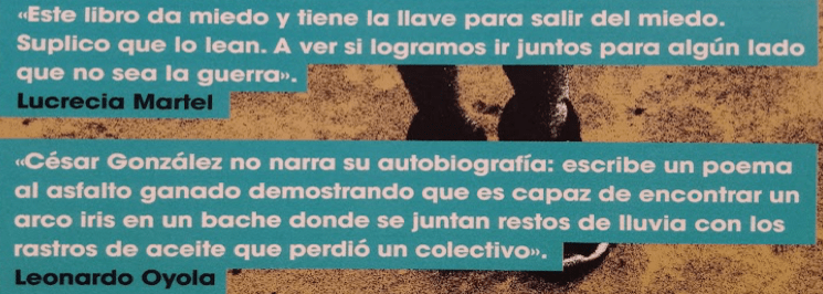 La contratapa de El niño resentido reúne dos textos. En uno se destaca que “César González vindica su linaje” y que estamos ante “una novela lujuriosa y austera a la vez” que pone en primer plano “los devastadores años 90. Un wéstern como los de la tele. Uno de balaceras y choques y persecuciones. Uno de policías y ladrones”; el otro es un comentario de Lucrecia Martel que sostiene que el libro “señala con precisión las cosas que no se ven a través de los vidrios polarizados. Correr por pasillos que jamás voy a poder visitar de noche y entender de qué huyo. Una modesta alcantarilla por donde se escurren las ideas con las que enmascaramos nuestros privilegios. Este libro da miedo y tiene la llave para salir del miedo. Suplico que lo lean. A ver si logramos ir juntos para algún lado que no sea la guerra.” Los tonos y las perspectivas de esos textos son bien diferentes –al punto que casi no parecen referidos a la misma narración-, el lector puede inferir, y más al leer la solapa, que es una novela basada en la vida del autor o una crónica de sus primeros quince años. En la faja incorporada al volumen, Leonardo Oyola retoma ese aspecto, aun sin dejar de expandir, como una justa vindicación literaria, el encuentro de géneros: “César González no narra su autobiografía: escribe un poema al asfalto ganado demostrando que es capaz de encontrar un arco iris en un bache donde se juntan restos de lluvia con los rastros de aceite que perdió un colectivo.”