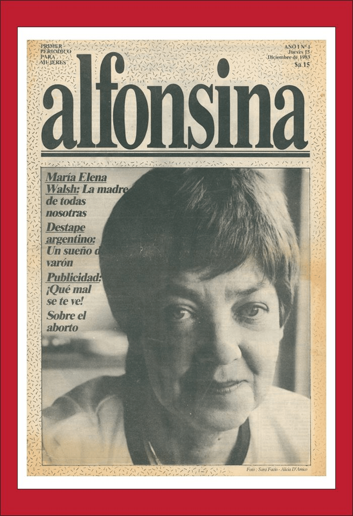 Y sobre quien se ha dicho, y suscribo, que sus escritos, actuaciones y modos de leer vienen funcionando como un prisma privilegiado para revelar diagnósticos epocales, elijo esta vez la visión microscópica para hacer el recorrido inverso y me detengo en el objeto encontrado; no el de la remera sino el editorial del número uno del primer periódico “para mujeres” (así las cosas, por entonces) que Moreno funda el 15 de diciembre de 1983. Primer número, primer periódico, primeras páginas, primavera. Se trata de alfonsina, en minúsculas, que cruza el nombre de la ¿mal/bien? llamada poetisa que derrama retórica tardo romántica sobre la loba, la oveja descarriada y las mascarillas de la vanguardia con el apellido del primer presidente elegido por un pueblo devastado después de un mundo de siete pozos (y medio).