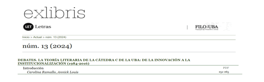 El 30 de abril se realizó en la Facultad de Filosofía y Letras, UBA, la presentación del dossier “40 años de la cátedra de Teoría y Análisis C”, publicado en el último número de la revista Exlibris http://revistas.filo.uba.ar/index.php/exlibris/issue/current/showToc. El dossier, coordinado por Carolina Ramallo y Annick Louis, hace un exhaustivo recorrido coral de la cátedra que introdujo en la Facultad la disciplina. Escritores del Mundo publica el texto que Miguel Vitagliano compartió en la presentación.